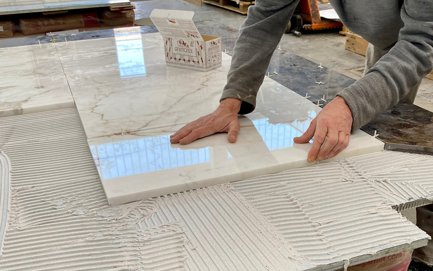 I blocchi di marmo vengono adagiati in maniera definitiva sul piano con precisione e attenzione alle fughe.