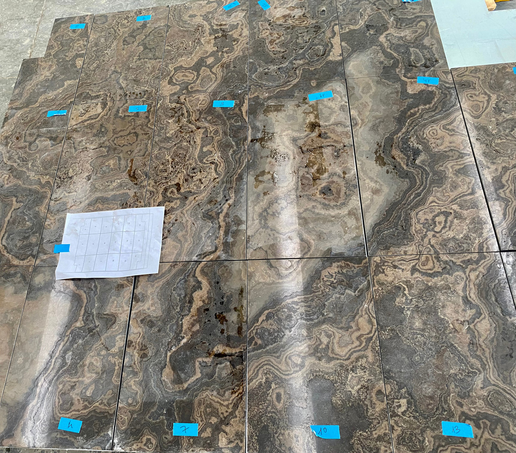 Viene fatta una posa di prova, come da progetto, dei blocchi di marmo tagliati su una base di ferro fornita dal cliente.