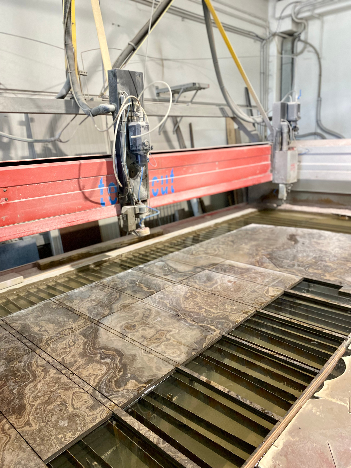 Le lastre di marmo vengono tagliate seguendo i progetti dal macchinario idrogetto.